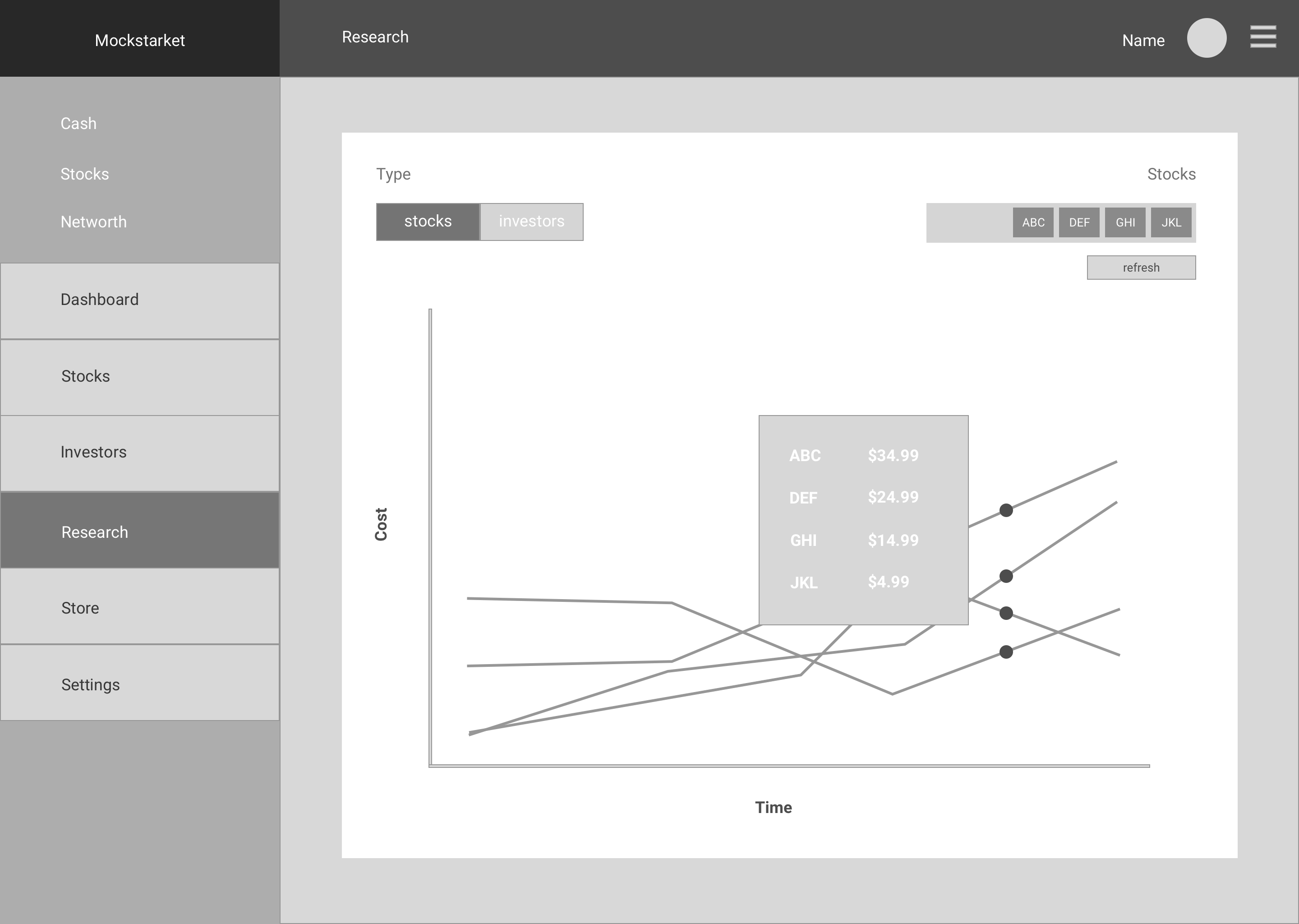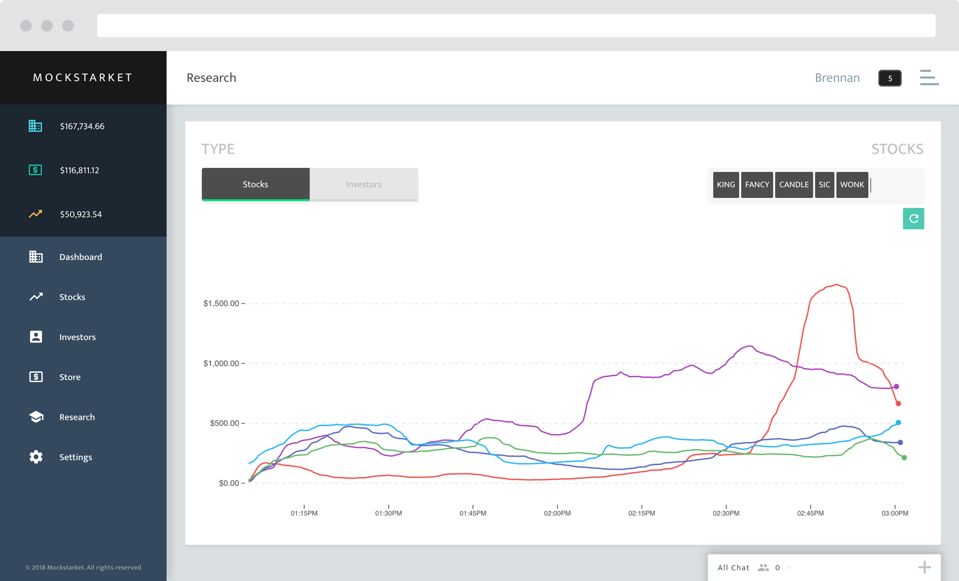 Buying and selling stocks at the right moment is essential to beating other players in Mockstarket. Experienced players will frequently chart the performance of a stock or another investor in order to inform their decision making. The research tool enables users to create a data visualization of up to 5 stocks or 5 players at a time.