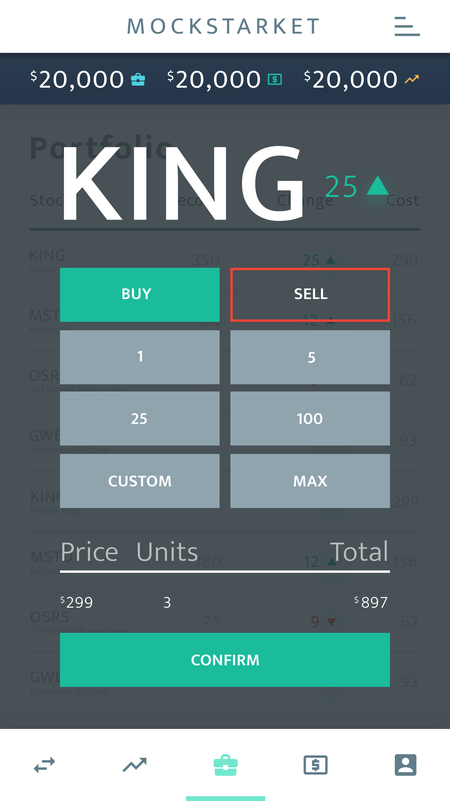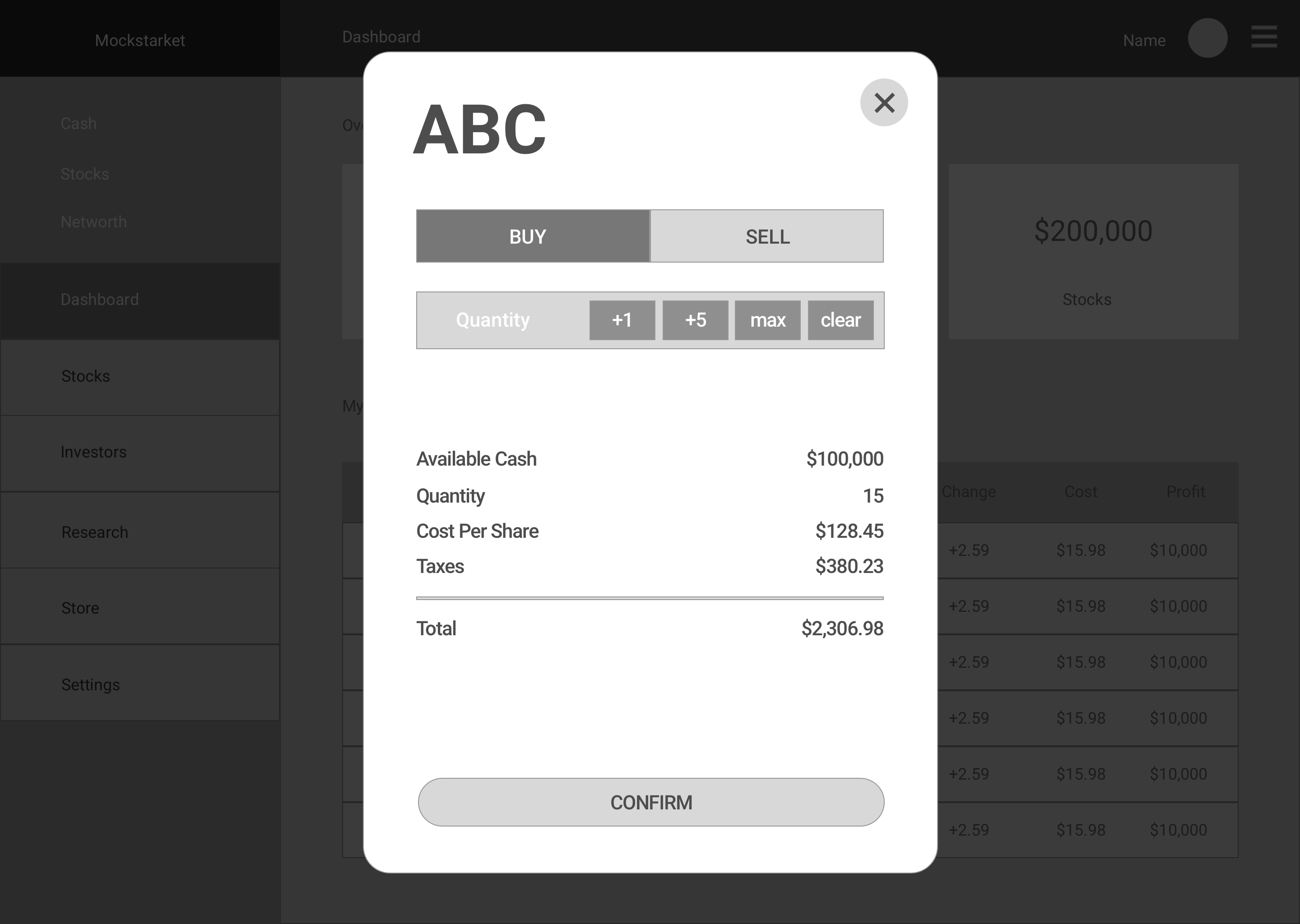Quickly buying and selling stocks is the bread and butter of Mockstarket. I wanted to design an intuitive modal interface that allowed users to buy and sell stocks quickly as well as get prospective information prior to completing the purchase or sale. In addition to the standard numberic input field, I added a set of calculator-esque buttons that allow the user to add to their order, as well as automically buy or sell the maximum allowable amount.