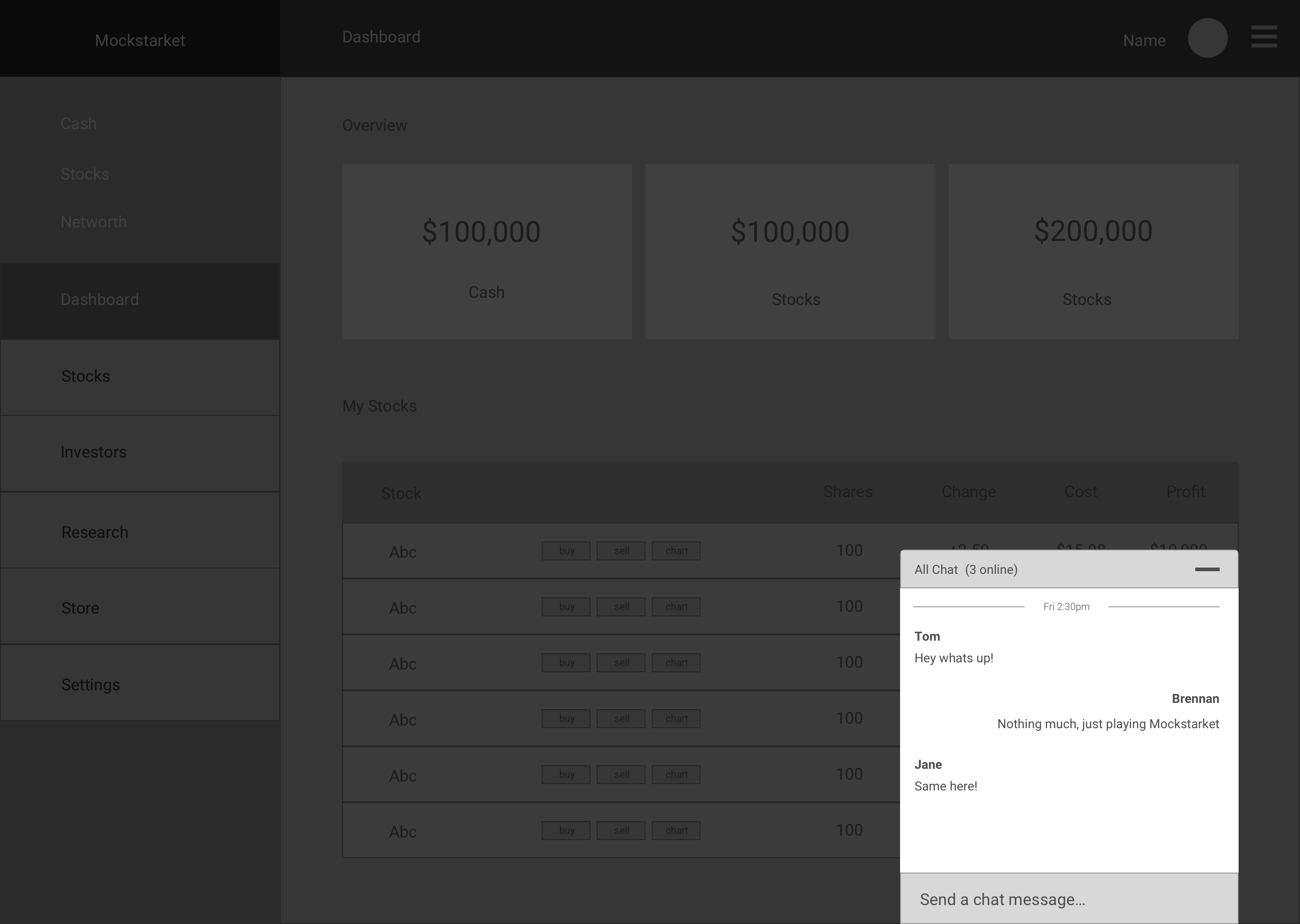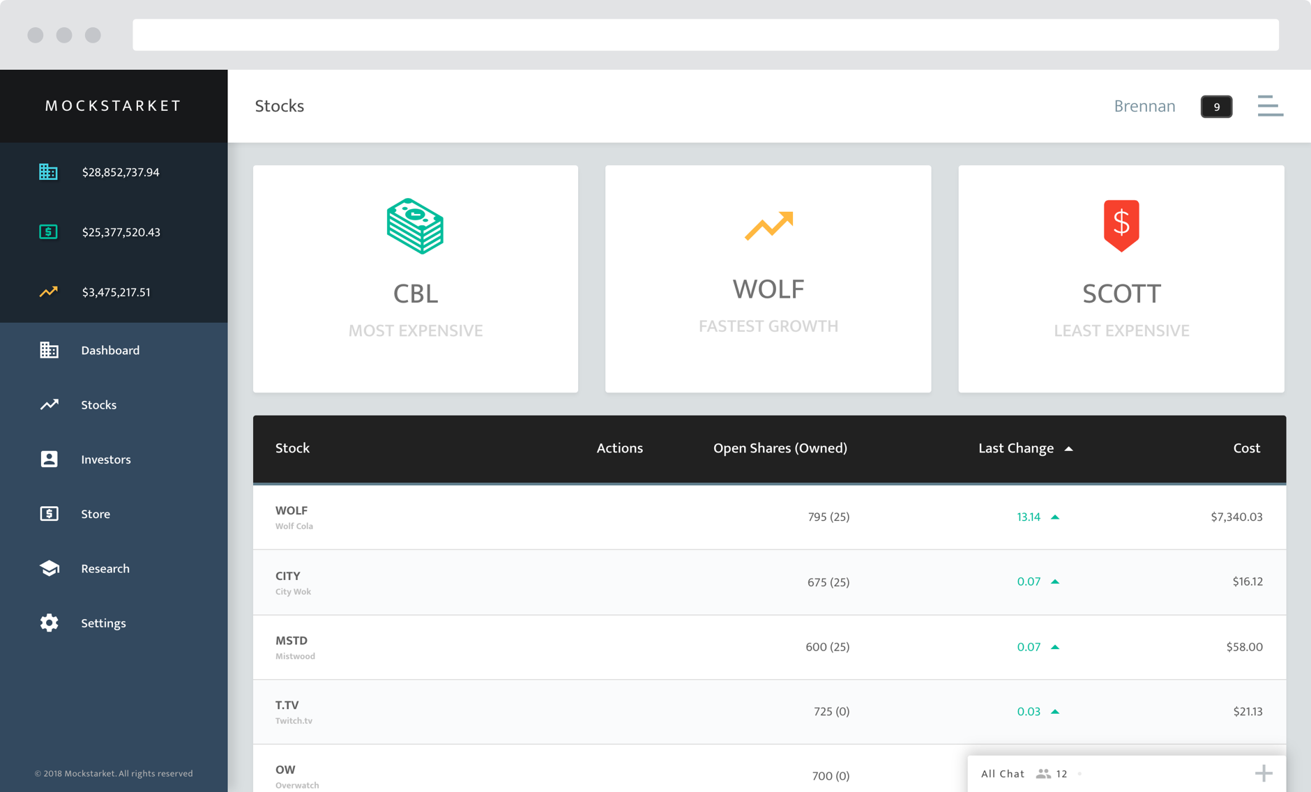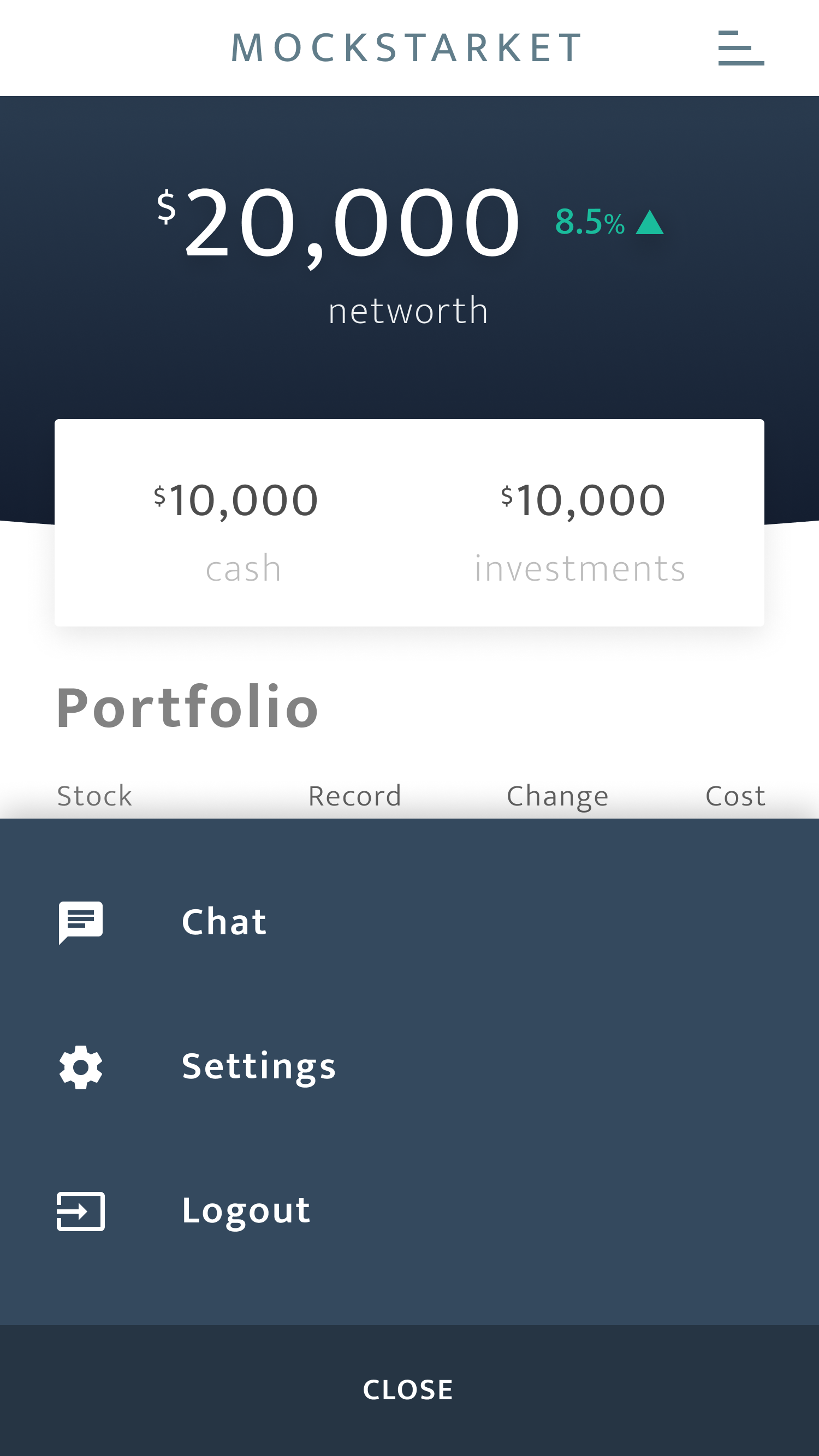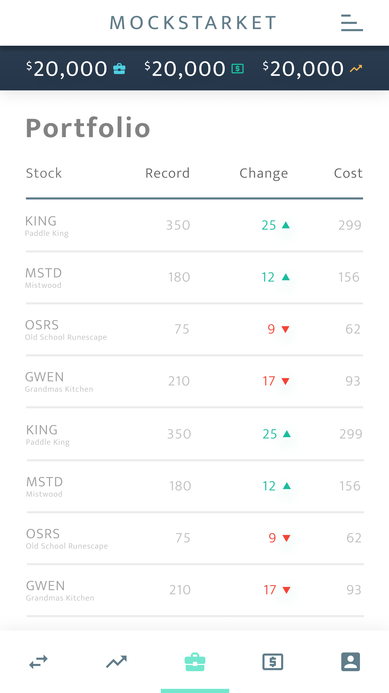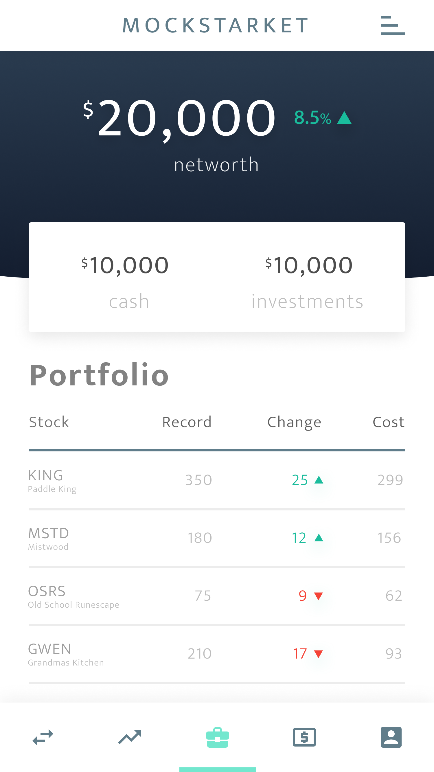 Mockstarket is real-time gamified stock market where players can create an account for free, buy and sell stocks, level up, acquire items to boost their outcomes, and chat with other players along the way. All of the thrill of trading stocks without any of the risk.